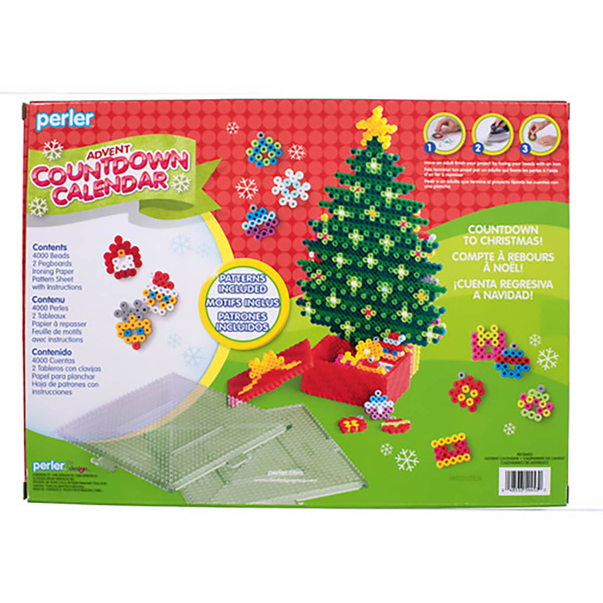 Create a 3-dimensional Christmas tree. 24 ornaments. and other accessories with this fused bead kit. Count down to Christmas by adding an ornament to the tree each day. This makes a great family project for the holiday season. Detailed illustrated instructions included. Perler beads are great for promoting fine motor skills. color recognition. and imaginative play. For ages 6 and up. Contains 4000 beads. 2 pegboards (large interlocking squares). pattern sheet with instructions. and ironing paper.
