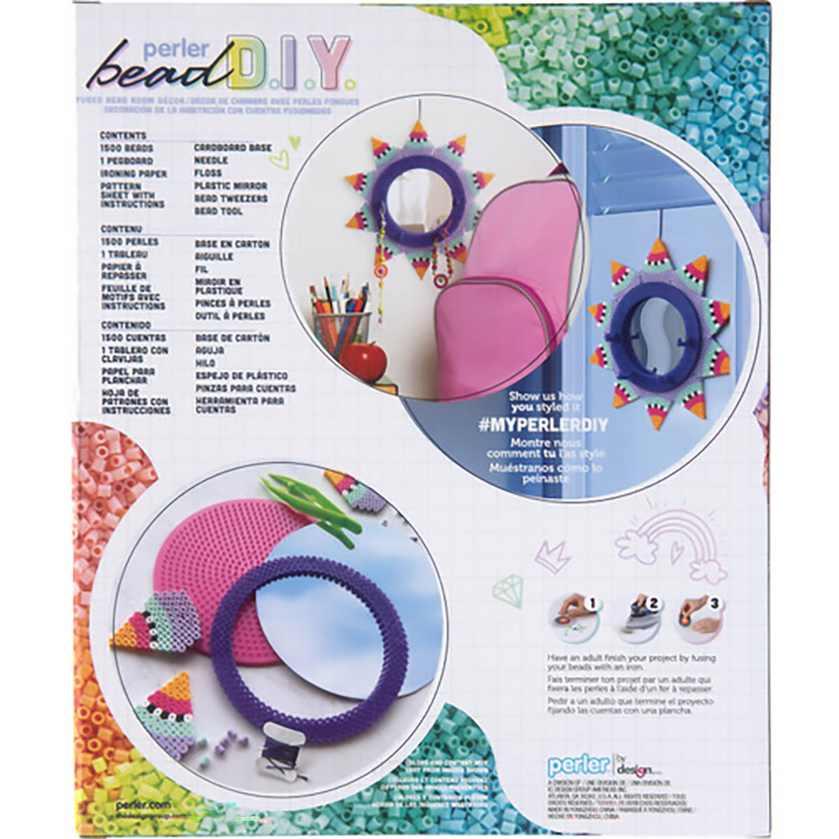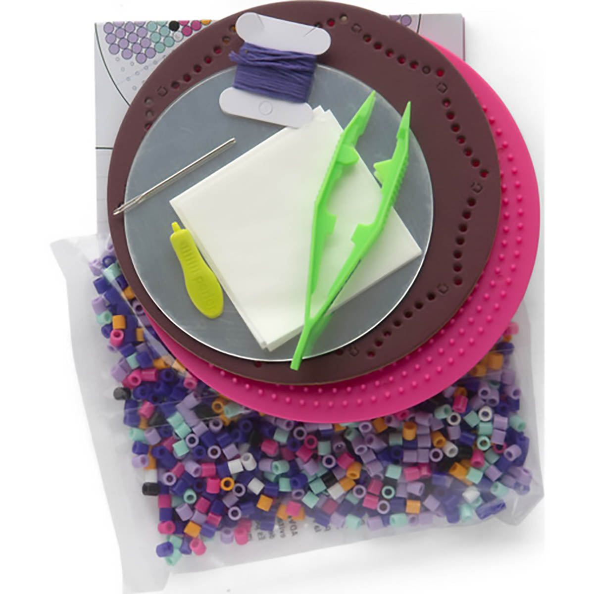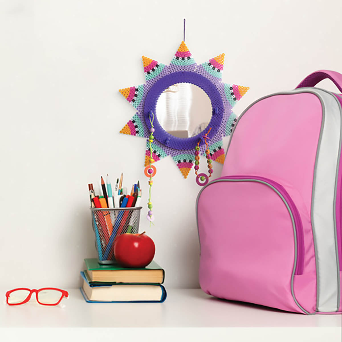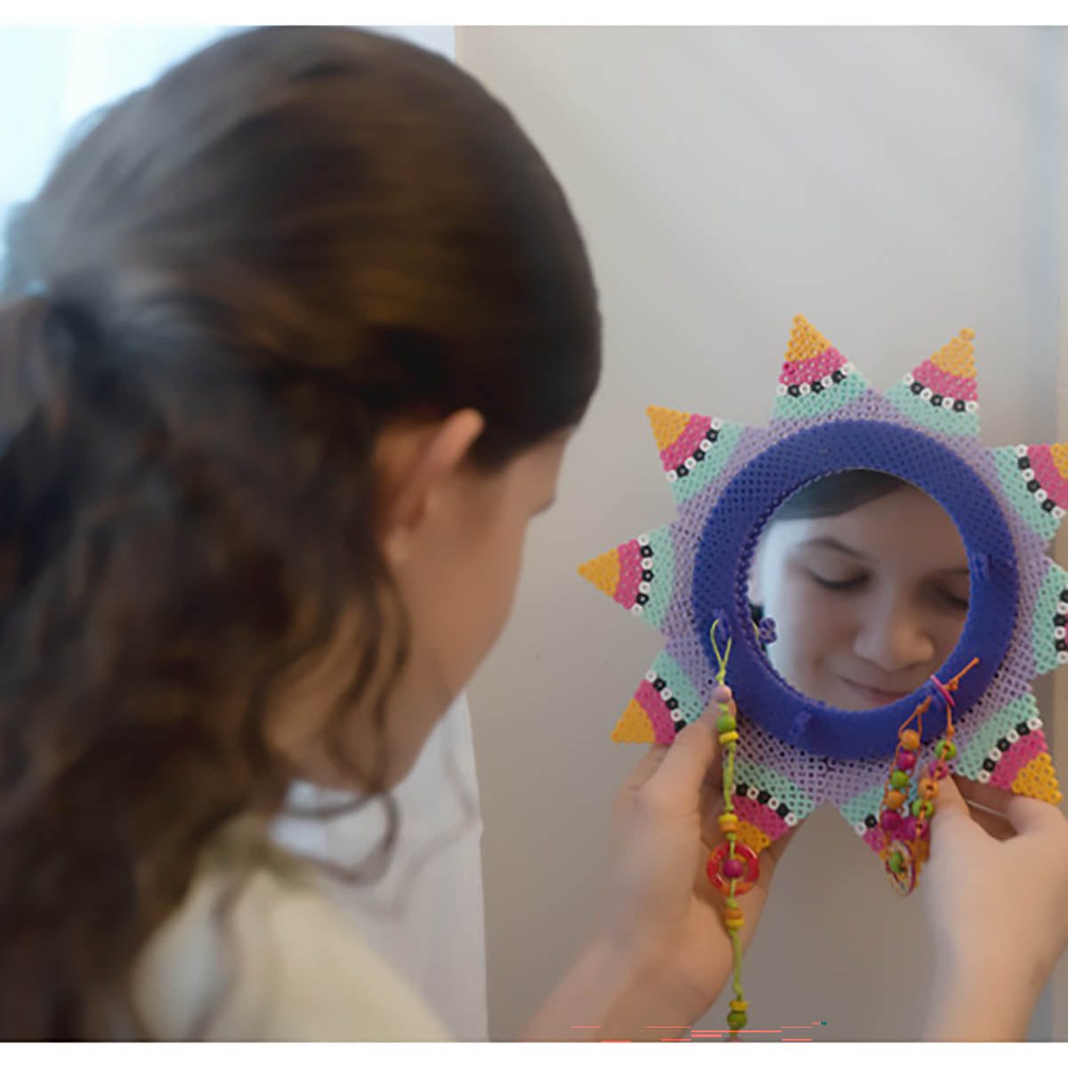 Create this piece of room décor that’s both fun and functional using Perler fuse beads. It’s a jewelry organizer and mirror all in one! Finished size of organizer is 9.5 x 9.5 inches. For ages 8 and up. Kit contains 1500 beads. pegboard (large circle). pattern sheet with instructions. ironing paper. bead tweezers. bead tool. plastic mirror. cardboard base. needle. and floss. Ironing to be done by an adult only.
