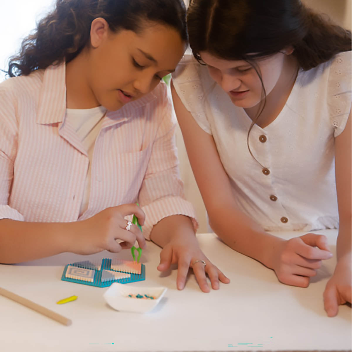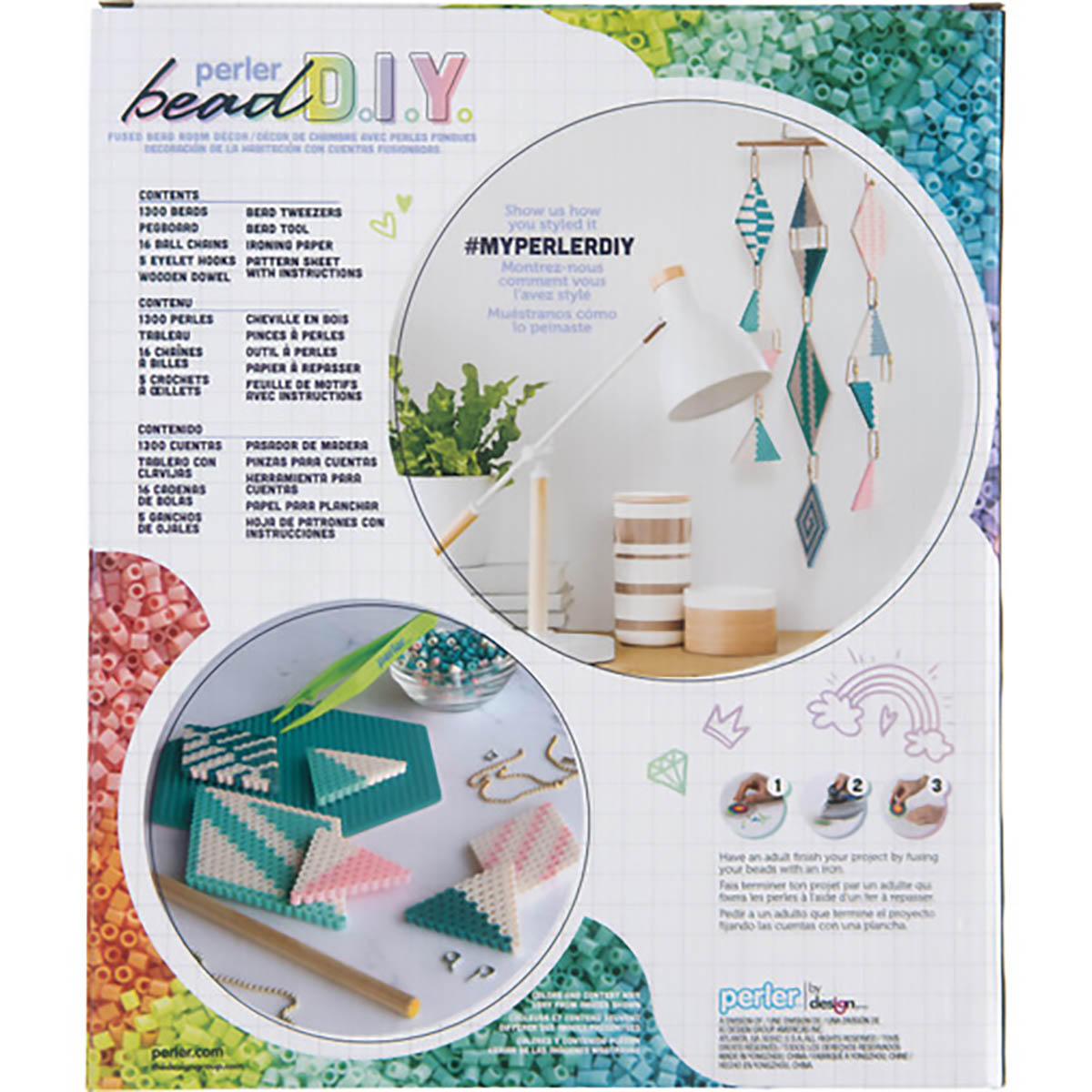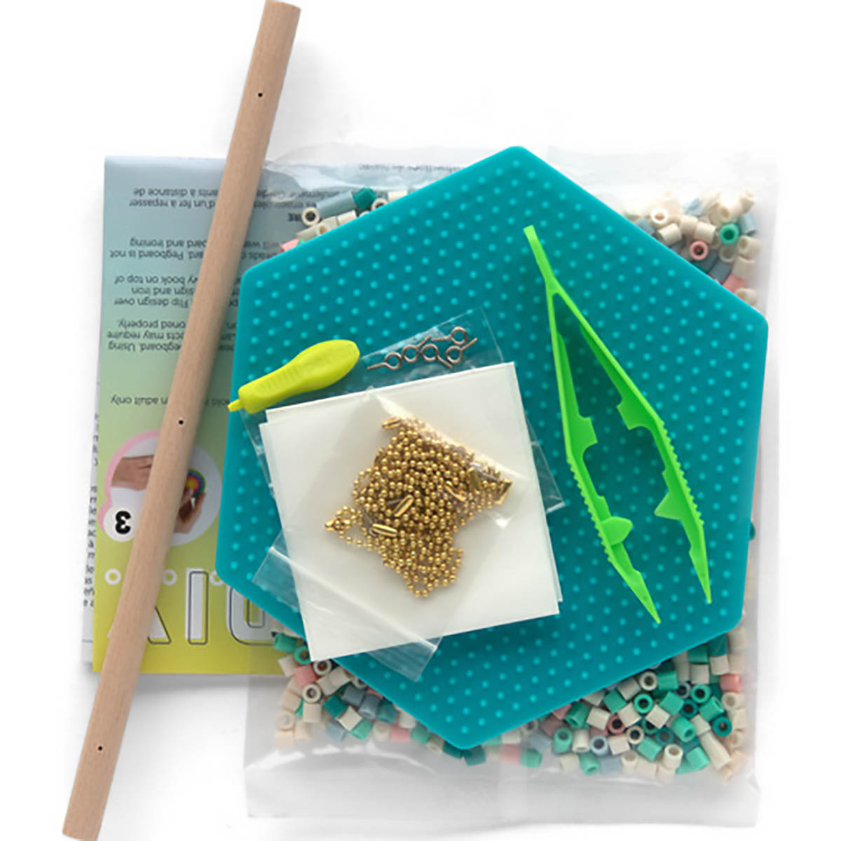 This geometric mobile made from Perler fuse beads will make a great accent for your room. It’s fun and easy to create this kinetic bead art and you can change the configuration anytime you like! Finished size approx. 9 x 15 inches. For ages 8 and up. Kit contains 1300 beads. pegboard (large hexagon). pattern sheet with instructions. ironing paper. bead tweezers. bead tool. wooden dowel. 16 ball chains. and 5 eyelet hooks. Ironing to be done by an adult only.
