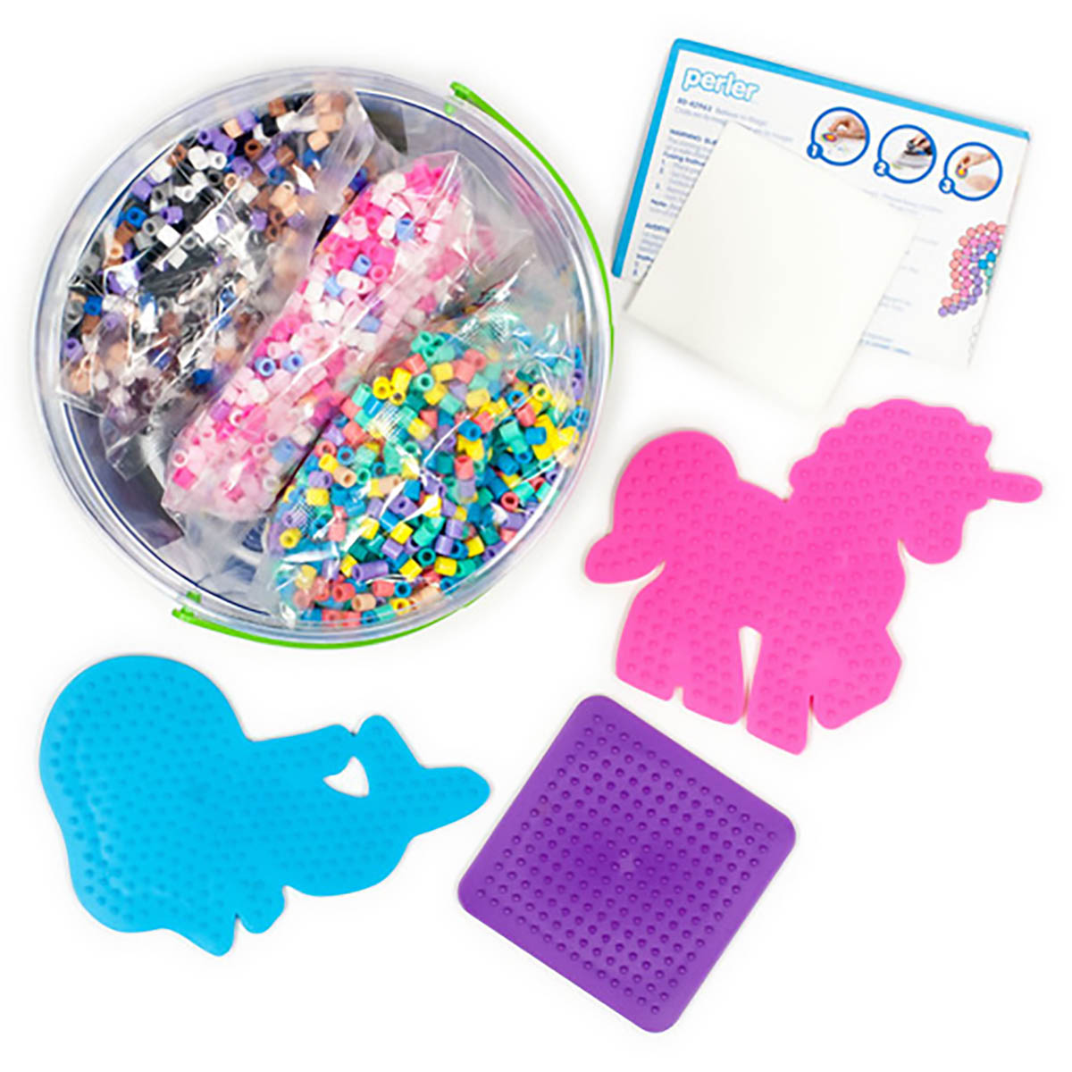 This fuse bead activity kit will provide hours of creative fun. Patterns included to make 13 different designs. including mermaids. unicorns. and more. And there’s plenty of beads to make your own magical designs! Designed for ages 6 and up. Kit contains 8500 beads. 3 pegboards (small square. unicorn. and mermaid). pattern sheet with instructions. and ironing paper. Pegboards and ironing paper are reusable.