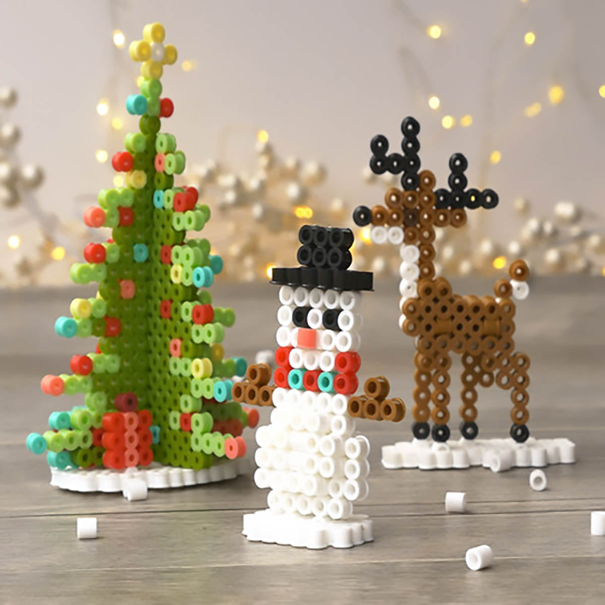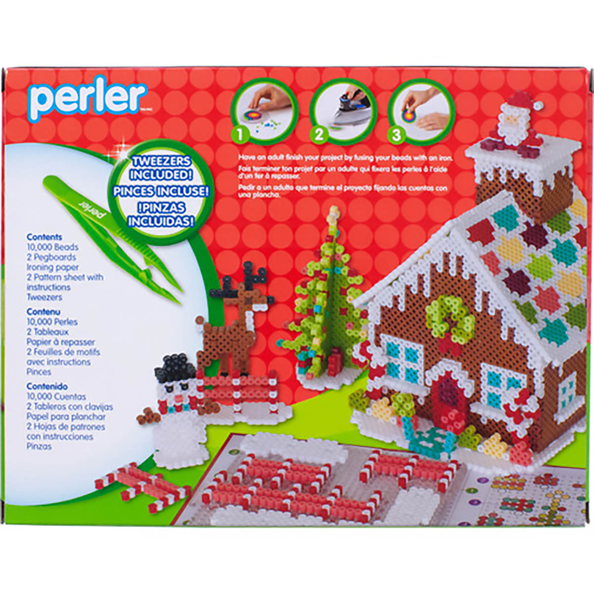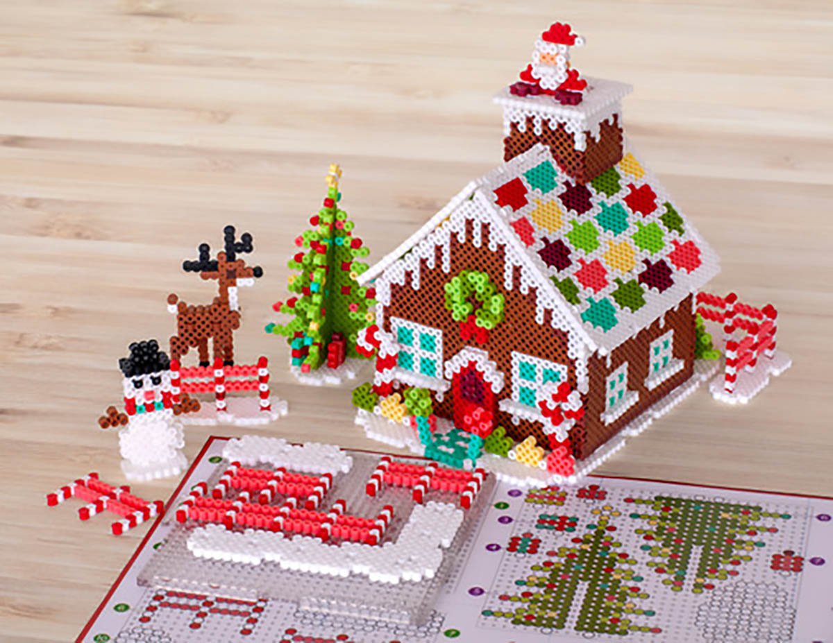 This Gingerbread House Kit makes a great family project for the Christmas season. This 3-dimensional holiday design features a home dripping with sweetness. as well as Santa. a reindeer. a friendly snowman. and some tasty treats. Detailed illustrated instructions provided. For ages 6 and up; some adult assembly required. Includes 10.000 beads. 2 pegboards. 2 pattern sheets with instructions. tweezers. and ironing paper