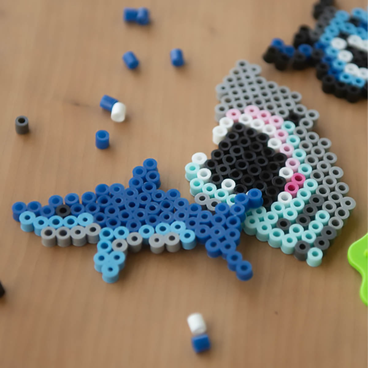 The Perler Sharks Activity Kit lets you create sharks. sharks. and more sharks! Kit includes patterns for 9 projects and is perfect for summer playdates or for gifting. Designed for ages 6 and up. The Perler Sharks fused bead kit includes 2000 beads. 3 pegboards—small square. fishy and 5-pointed star—plus ironing paper and a pattern sheet with easy instructions. Bead colors include light pink. bubblegum. toothpaste. pastel blue. dark blue. blueberry crème. gray. dark gray. black. and white.
